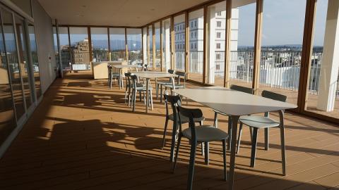 サンルルームに、テーブルとイスを設置しました。明るく開放的な空間のなかで、日差しを感じながら読書を楽しむことができます。