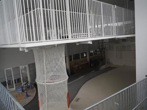 こちらは2階キッズパークです。なみなみ床と上部分のネット遊具は筒状の出入り口でつながっています。子どもたちが楽しく遊ぶ姿を想像するとワクワクします。