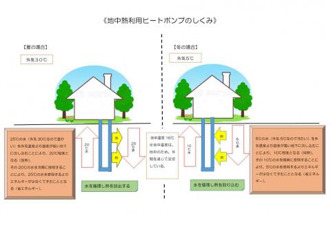 夏はヒートポンプで冷風をつくり、室内の熱を地中に放出することにより室内を冷やします。冬は地中から熱をもらい、ヒートポンプで温風をつくり室内を暖めます。この温度差を利用するのが。『地中熱利用』です。