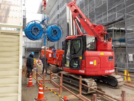 昨年度から今年度にかけて、tetteの建設工事と並行し、地中熱交換器設置工事が行われました。この工事は公益財団法人日本環境協会の二酸化排出抑制対策事業費等補助金を活用して行われたもので、tette完成後は施設の一部で地中の熱を利用し冷暖房などの空調に使用されます。