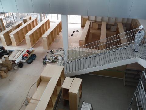 こちらは3階メインライブラリーです。書架の一部が配置され、図書館の雰囲気が出てきました。テーマ配架を導入するなど、わかりやすく興味を引く書架配置を目指します。また、自動貸出機を設置するなど利用者の利便性を高めます。