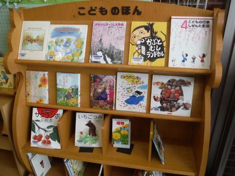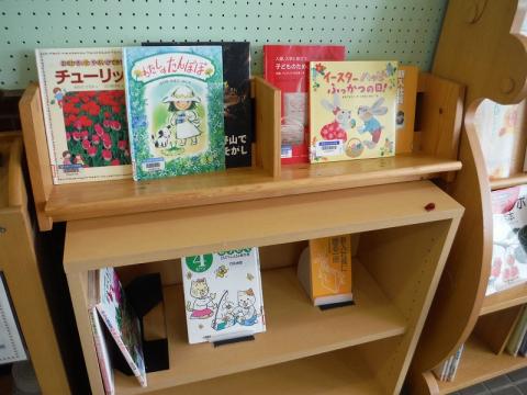 須賀川市図書館の入口付近には、毎月のテーマに沿った本を展示しています。今月は、花やイースターなどの本が並んでいます。