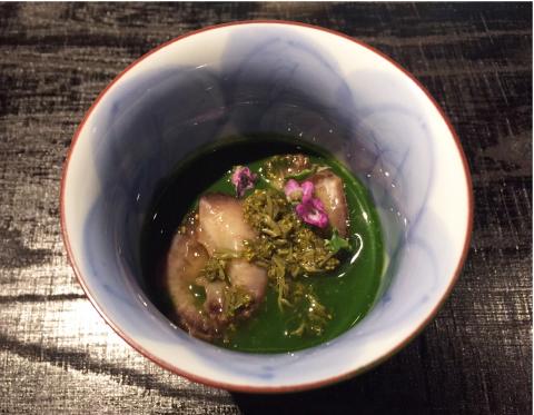 コルビさんが飛騨高山から取り寄せた、なまこを使った茶碗蒸しの表面に広がる鮮やかな緑色のソースは、須賀川産のほうれん草。ほうれん草特有のえぐみは全く感じられず、柔らかな甘みが口の中に広がります。ソースの上には、なまこのほか花山椒と穂紫蘇があしらわれていました。きめ細かくなめらかな卵に歯ごたえのあるなまこ。ほうれん草のソースが結びつける異なる食材の組み合わせと、見た目も美しくおいしい茶碗蒸しに感動。コルビさんの料理を堪能すると同時に、須賀川の食材の可能性を沢山感じた夜でもありました。