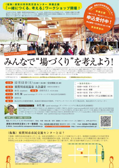 これからできる(仮称)須賀川市市民交流センターには、市民のみなさんが交流したり、主体的に活動できる機能がたくさんあります。(仮称)須賀川市市民交流センター準備企画の本ワークショップシリーズ「かえりたくなる街のつくり方」は、開館後の利用方法を具体的に想像巡らせ、皆さんの毎日がより充実していく道すじを一緒に考えていくことを目的としています。