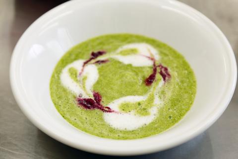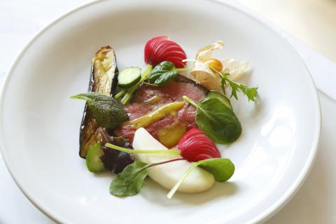 前半は、ゲストのコルビさんが会場でつくる地元の食材をつかった料理のデモンストレーション。出汁ときゅうりだけでつくったスープ、にんにくとビーツのカプチーノ仕立て。リーフや茄子、梨など、鮮やかな野菜と福島牛のローストビーフ、ソースはからしとわさび、蜂蜜。ワークショップ前日におとずれた農家さんの圃場で食べた味にインスピレーションが沸きメニューが完成した、コルビシェフによる地元食材をつかった一汁一菜。