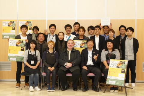 (仮称)須賀川市市民交流センタープロジェクトチームの市役所職員の方々と、ゲストコルビさんを囲んで。