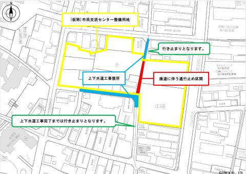 このたび、あきない広場等解体工事が完了しましたが、(仮称)市民交流センター整備用地周辺では、引き続き上下水道工事等が実施されます。また、今後本格的に整備用地内の整地工事等を実施するため、引き続き通行止め(用地の一部となる市道部分を廃道)となりますので、市民の皆様には大変ご迷惑をおかけいたしますが、迂回のご協力をお願いいたします。