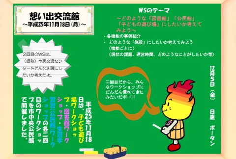 ちょうど1年前、市民の皆さんと開催したワークショップ(WS)について、『想い出交流館』として、お知らせしています。 今日は、平成25年11月18日(月)に開催したWSの想い出です!! 引き続き『想い出交流館』をよろしくボー!!
